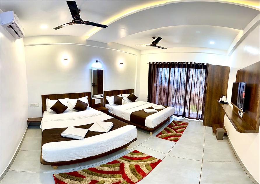 Stay in our luxurious Jacuzzi Lake View Room featuring a private balcony with stunning views of Shivsagar Lake and the hills. Enjoy a relaxing bath in your private Jacuzzi, modern interiors with a king-size bed, smart TV, air-conditioning, and a stylish bathroom with rain shower. Perfect for couples and families looking for comfort, romance, and nature together.